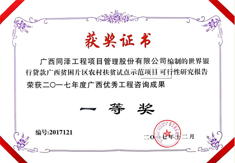 世辦銀行貸款廣西貧困片區農村扶貧試點示范項目可行性研究報告榮獲2017年度廣西優秀工程咨詢成果一等獎